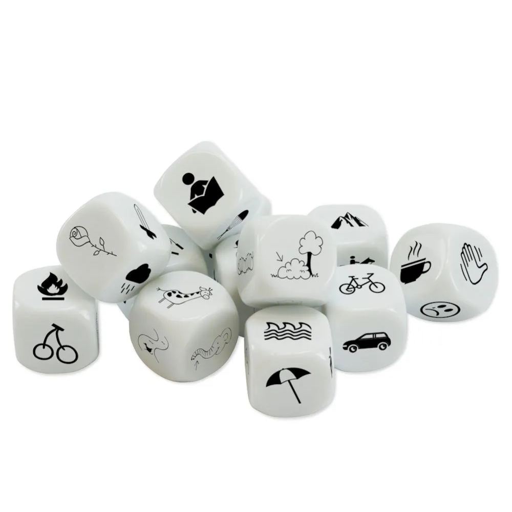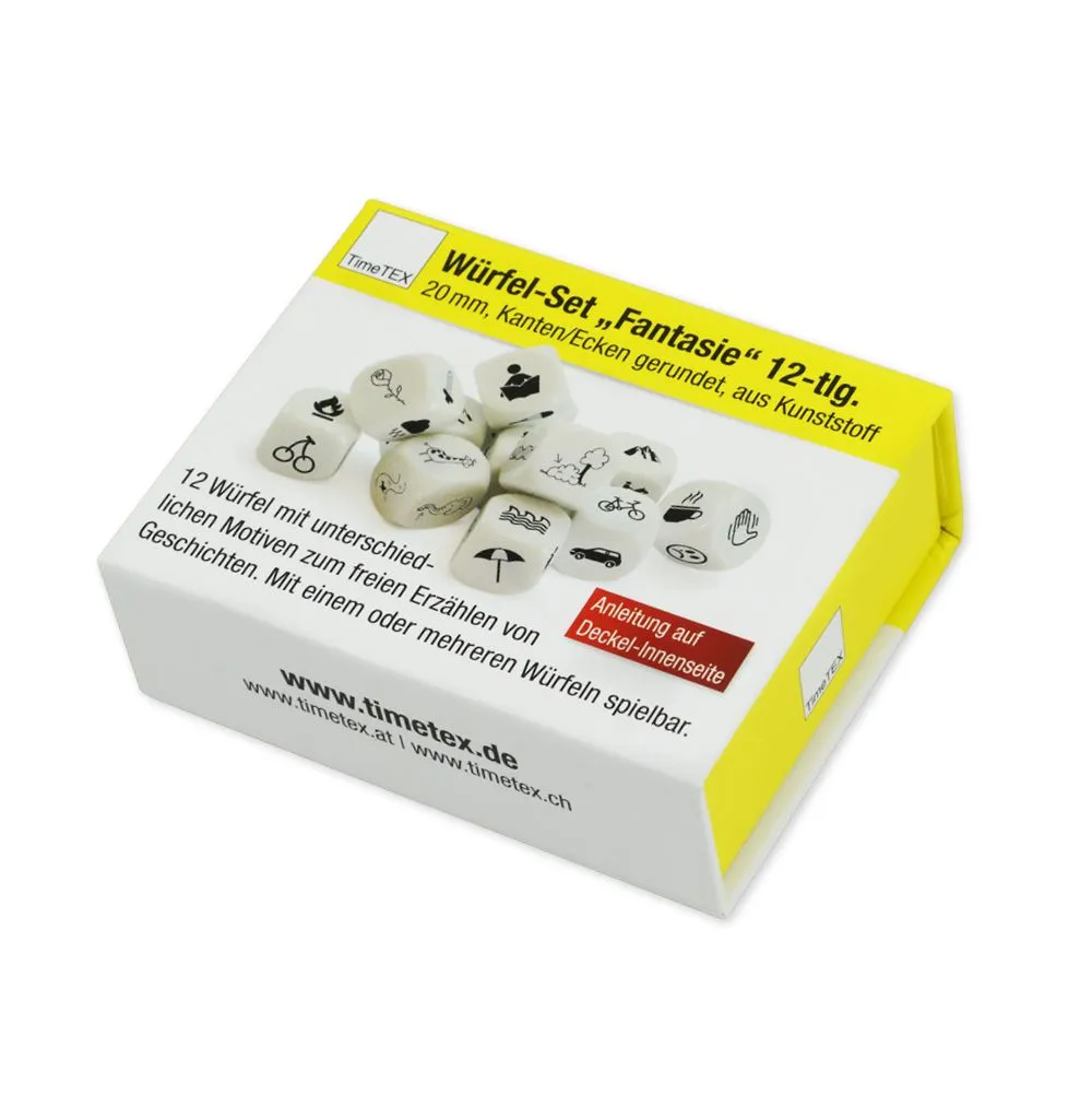 Dice set Fantasy consists of 12 six-sided dice with fun motifs for stimulating creativity and imagination. Depending on the level, the children roll dice with one or more dice and shapes, based on the images, sentences and stories. Each side shows a different icon. The dice are delivered in a practical storage box. The black print is particularly visible on the white dice.