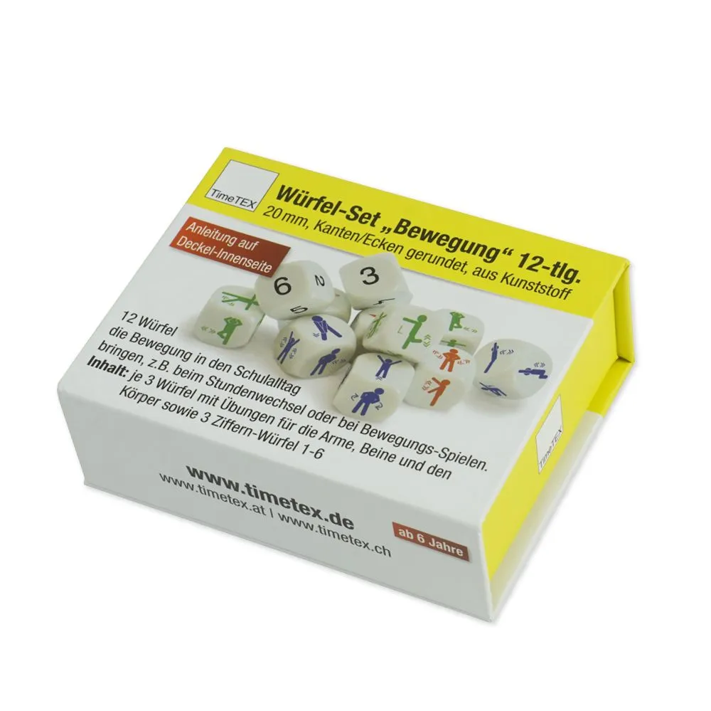 The dice set movements are, as it were, a kind of story dice with which you can playfully let children move in between. The set consists of 12 six-sided dice with which literally movement comes into the lesson.