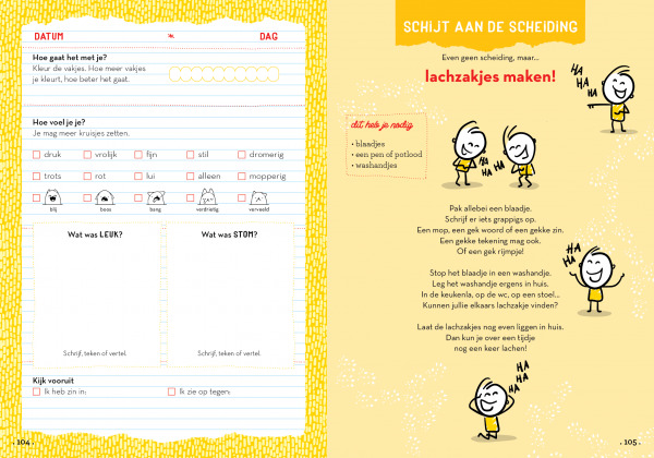 Divorce chatter helps to make difficult topics negotiable by means of serious and surprising questions and assignments. Child and parent fill in the book together: on a fixed day in the week, at a changeover moment or just when there is a need for it. On each left page, a child can tell how he or she is doing. On each right page there are varied assignments in which both emotional and practical matters are discussed such as: Would you like to ask mom or dad again: Why are you divorced? Do you agree or disagree with the statement: I have become wiser because of the divorce. Make a list of things you don’t want to drag back and forth anymore or a list of things you want to decide on. Divorce chatter offers tools to start a conversation together. To ask or tell what might be difficult or painful. But also to share what is already going well, and to look together at how you can make things nicer.