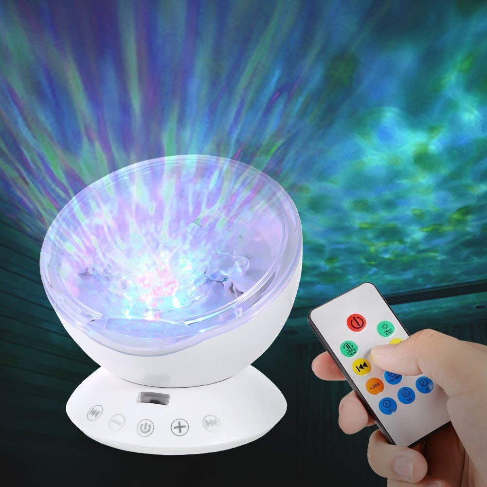 The ocean wave projector with speaker is a night light with 7 different visual effects. Connect your own music to the projector to create a nice atmosphere before bedtime or for use to snooze in a snooze room.