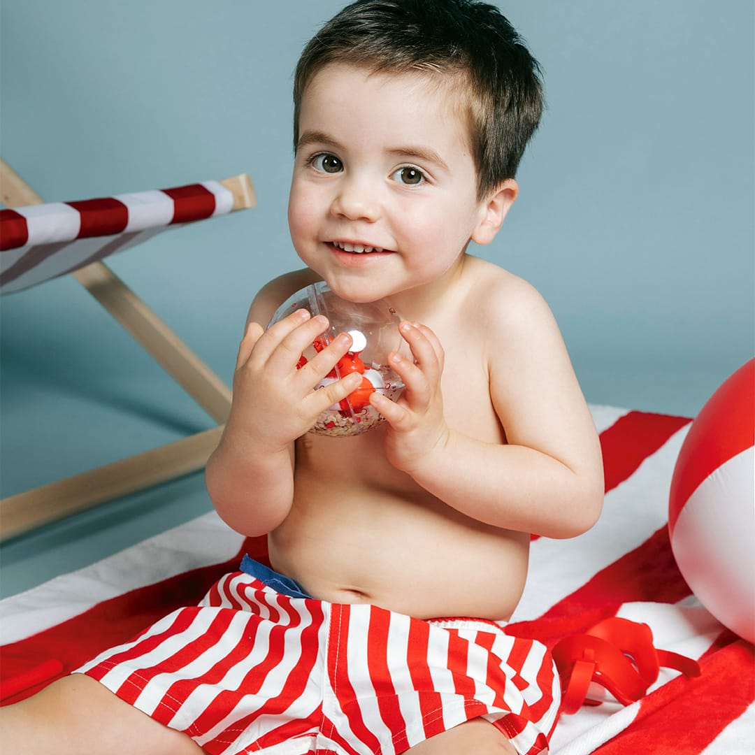 Ontdek onze unieke sensorische bal (met onze onmiskenbare magische touch) waarin vrolijke krabbetjes zwemmen tussen fonkelende glitters.