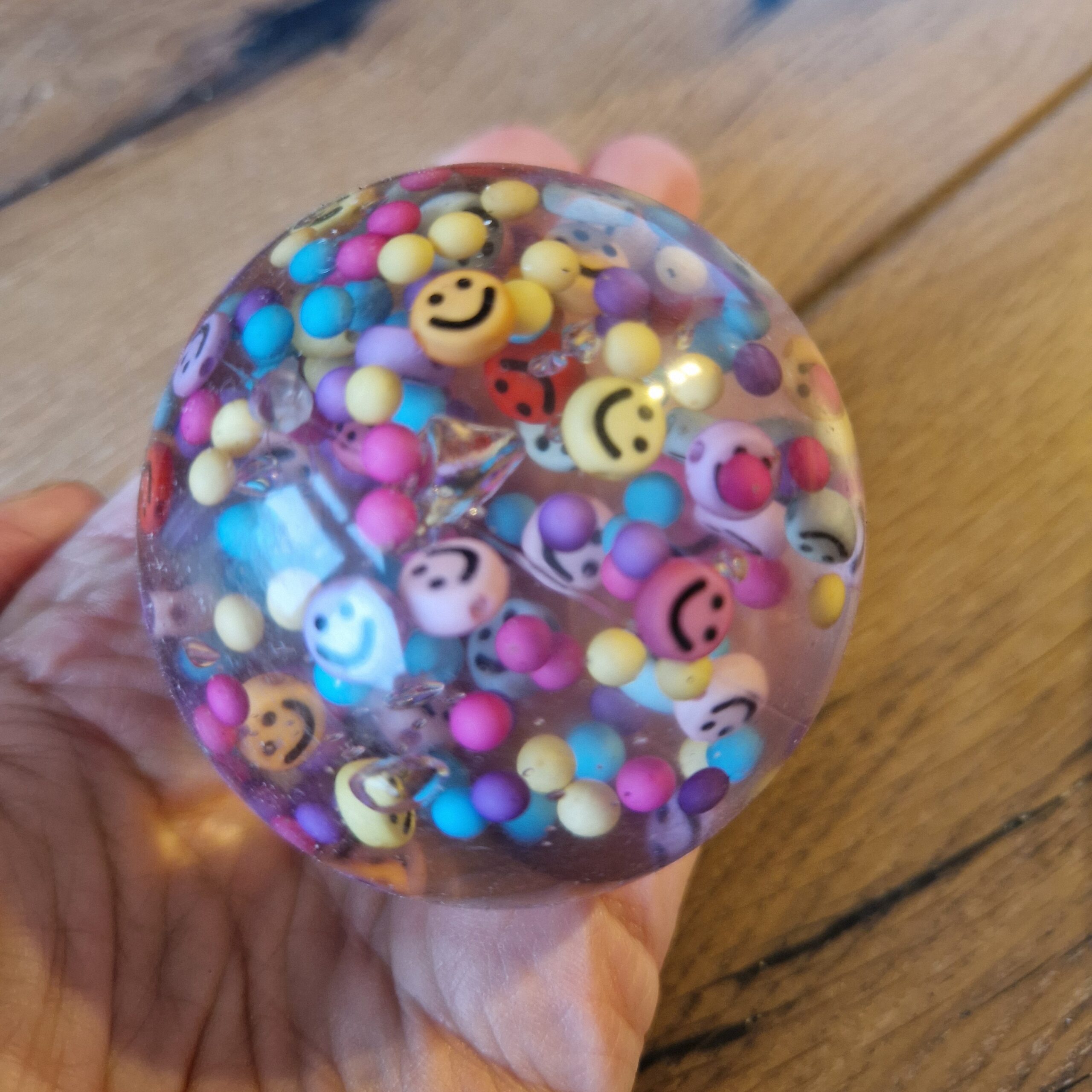 Vrolijke smiley squishy stressbal van 6 cm. Zacht, stil en ideaal als fidget voor kinderen met spanning of prikkelverwerkingsproblemen.