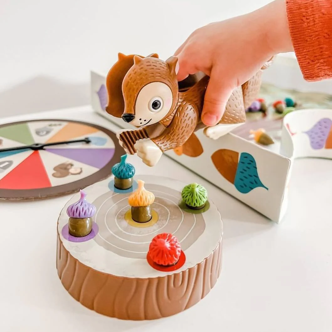 Players turn the turntable and use the Squirrel to pick up acorns and place them in the matching colored hole in their tree trunks. The first person to fill his logbook wins.