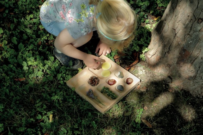 The wooden sorting bin of Yellow Door compartments in different sizes. Use the sort scale to sort and present found objects. This tinker tray offers plenty of opportunity for research and is practical and portable enough for children to collect objects from outside and carry them safely.