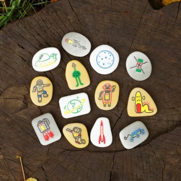 Storystones Space challenges children to bring stories about space to life. The set consists of 13 beautifully engraved storystones. Children can build their story about the space by choosing from the characters, environments and objects.